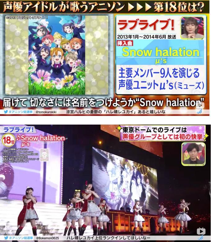 获得第18名的LOVE LIVE《Snow halation》更是奠定了声优偶像在音乐界的地位。μ's作为最有名的“从动漫中走出来的偶像团体”,将动漫中的组合真人化,以本人的形式站上舞台,成为了首个在东京巨蛋开5万人的演唱会的声优组合。