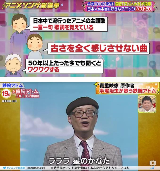 比如获得第19名的《铁腕阿童木》的主题曲《铁腕阿童木之歌》,观众的评价为“在全日本流行的动漫主题曲,每一句歌词都清晰记得”,“完全不觉得是老歌”, “就算在50年以后的现在听还是会很兴奋”。节目中更是播出了动漫原作者手冢治虫老师本人演唱歌曲的珍贵影像。