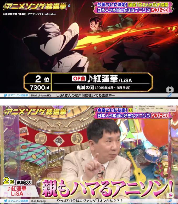 获得第2名的《鬼滅之刃》主题曲《红莲华》在去年的总选举中获得了第一位,今年虽然滑落到第2,人气仍然大热。