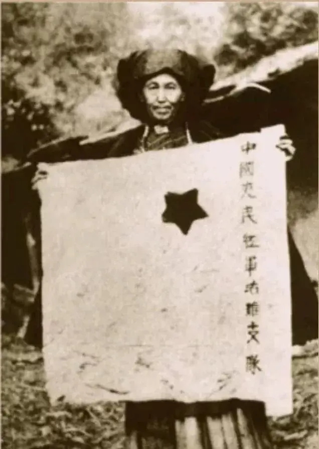 △小叶丹的妻子倮伍伍加嫫手持中国夷(彝)民红军沽鸡(果基)支队队旗