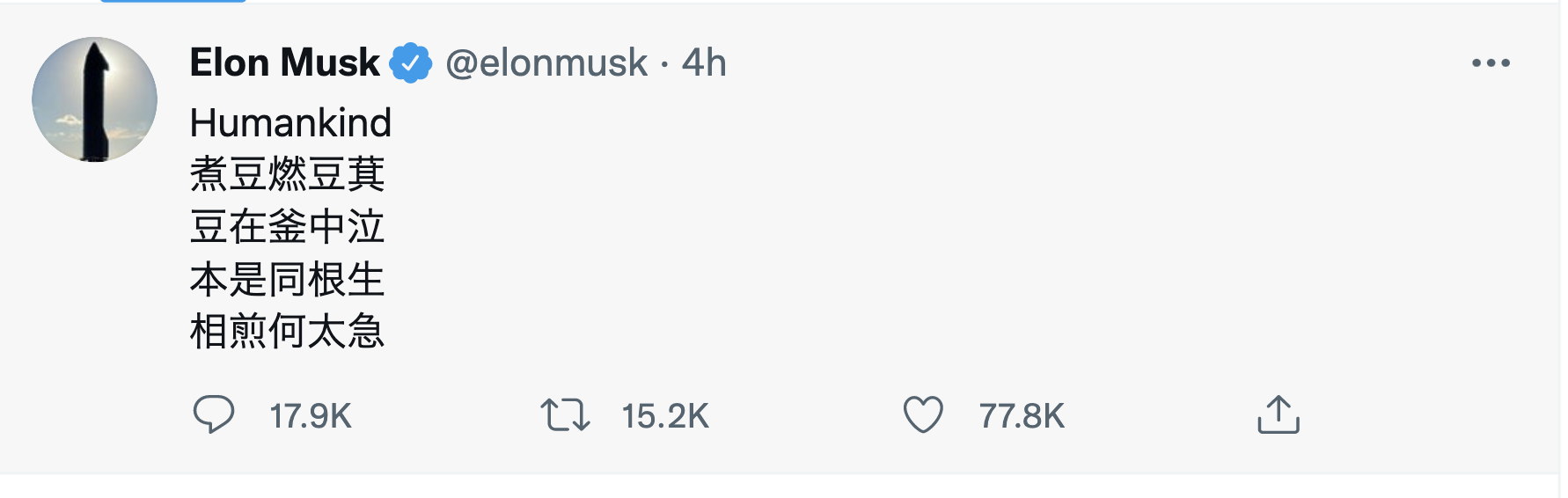 马斯克11月1日晚猝不及防地在其推特个人账号发布了曹植的《七步诗》——“煮豆燃豆萁 豆在釜中泣本是同根生相煎何太急”,并在诗句前题字“Humankind(人类)”。截至发稿,该推文已获得1.1万次转发和8万次点赞。