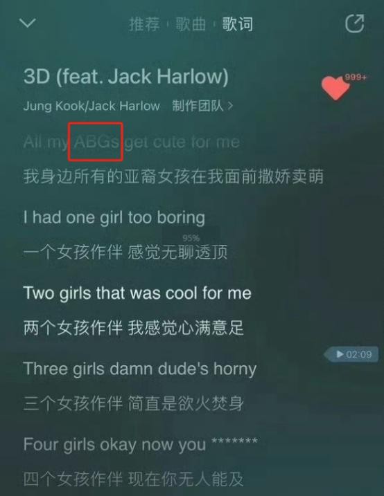首先,从歌词来看,在这首歌的rap部分,这一句歌词All my ABGs get cute for me,这句歌词的意思是所有的亚裔女孩都为了他装可爱,一个,两个,三个,甚至四个亚裔女孩寸步不离,其中提到的abg本身也是歧视性名称,类似俗语easy girl,被指丑化亚裔女生的形象,引起了很多人的不满。
