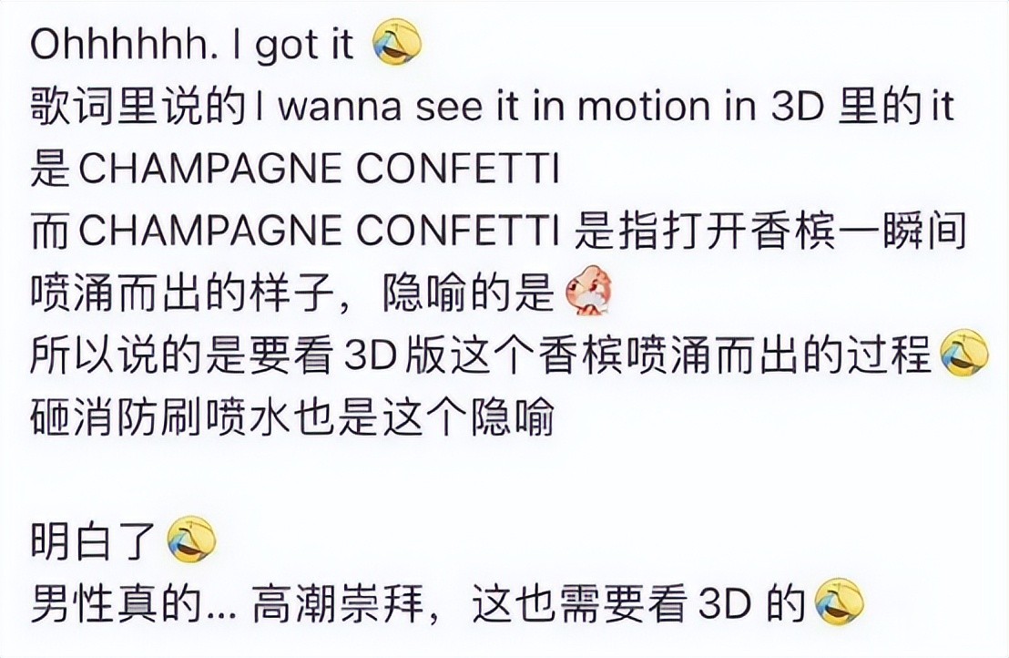 争议歌词既没营养也没内涵,更没有为歌曲加分,除了歌词之外,编舞动作和MV内容疑似存在X暗示,踩中大众雷点,其中一句I wanna see it in motion in 3D里的it指代的是CHAMPAGNE CONFETTI,CHAMPAGNE CONFETTI表达的是打开香槟一瞬间喷涌而出的意思,再往深一点想,这一段真正想要表达的意思不言而喻。