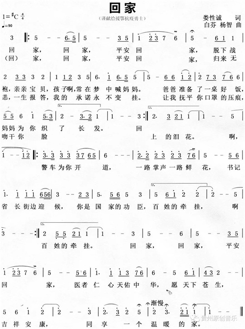 这几天,看了很多送、迎援鄂医疗队的新闻:飞机过“水门”;警车开道;市民沿街热泪相送,有的在路边长跪不起,揖送贵州援鄂车队。各省自治区都高规格迎接英雄凯旋,特别是贵州省,省委书记孙志刚、省长谌贻琴、省政协主席刘晓凯亲自到路边迎候,沿途街道,所有车辆自发鸣笛致敬。把这些感人的画面与出征时的画面联结起来,歌词以一位丈夫迎接妻子回家的口吻,娓娓道来。结尾处联想到新冠病毒正在世界各地漫延,从小家、国家联想到地球村,希望世界是一个共同体,所有生命安全无恙,和谐相处。