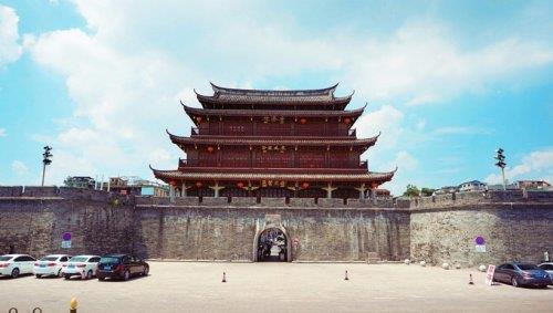 广济门城楼原称“广济楼”,也称“韩江楼”,民间俗称“东门楼”,是原潮州古城七门中最巍峨壮观的一座。同时既是潮州名城的主要标志,又是北堤城堤的重要关闸。广济楼始建于明,民国重修。是一座宫殿式三层歇山顶阁楼。原明代广济楼已不复存在,仅剩一些零构件,设计者依据清代潮州古城图的广济楼外观以及清代画家笔下的广济楼风貌,参考潮州城内遗留的明代建筑形式再行设计,把老楼遗存的老构件按原位安上,充分体现中国独特的“修旧如旧”原则。金漆的木雕莲花垂花檐及云纹三向华拱。耍头系云纹构造,突出明显。外向的华拱以偷心造为主。青砖红梁,具有明显的明代风格。城楼面阔七间,进深五间,采用了隋唐流行的飞檐风格。