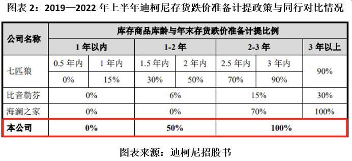 从招股书可以明显看到,迪柯尼的存货跌价计提政策与同行相比差异较大。报告期内,迪柯尼按“库龄法”计提存货跌价准备。针对库龄在1~2年的库存商品,迪柯尼计提比例为50%,对库龄在2年以上的库存商品计提比例为100%。