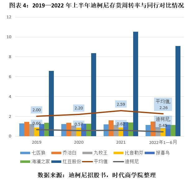招股书显示,2019—2022年上半年,迪柯尼的存货周转率分别为0.66次/年、0.57次/年、0.62次/年、0.45次/年,同期同行可比公司均值分别为2次/年、2.2次/年、2.59次/年、2.26次/年。具体如图表4所示。