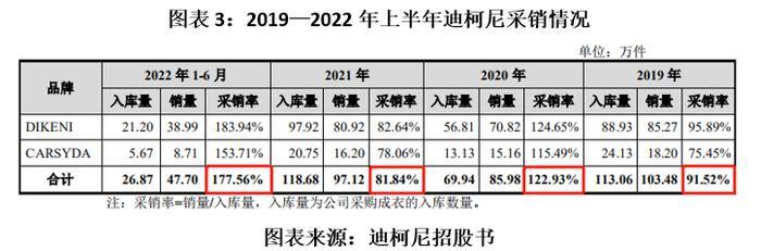 其中,2020年和2022年上半年,迪柯尼采销率分别达到122.93%、177.56%,均高于100%。根据图表3计算,报告期内迪柯尼入库量合计为328.55万件,销量合计为334.28万件,总销量高于总入库量。