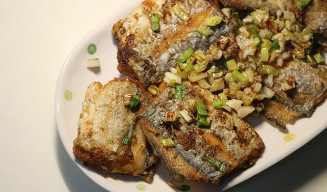 5.待每块鱼肉都已经煎炸完成先将鱼块起锅6.倒出多余的油只留部分爆香葱末的油量即可7.放入葱末蒜末于锅中爆香,续放刚刚炸好的鱼块8.均匀的傻上盐巴及白胡椒,在锅中将调味料拌匀,即可完成起锅盛盘