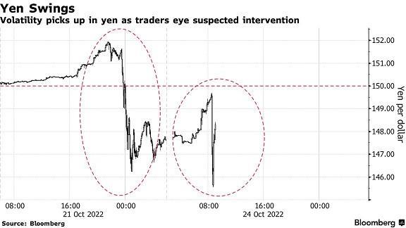 上周五,在一度接近152后,日元兑美元汇率盘中上涨近4%,至略高于146水平。《金融时报》援引交易员的估计称,日本上周可能动用了超过300亿美元来支撑日元。