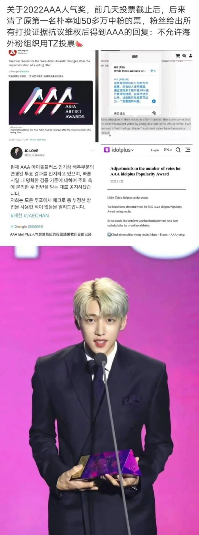 如果有喜欢朴宰灿的中粉,那更是对AAA深恶痛绝,带着Asia的颁奖活动,却在人气奖演员投票截止后清除朴宰灿中粉50万的票数,然后还称不允许海外粉丝组织用TZ投票?!真大离谱事件!