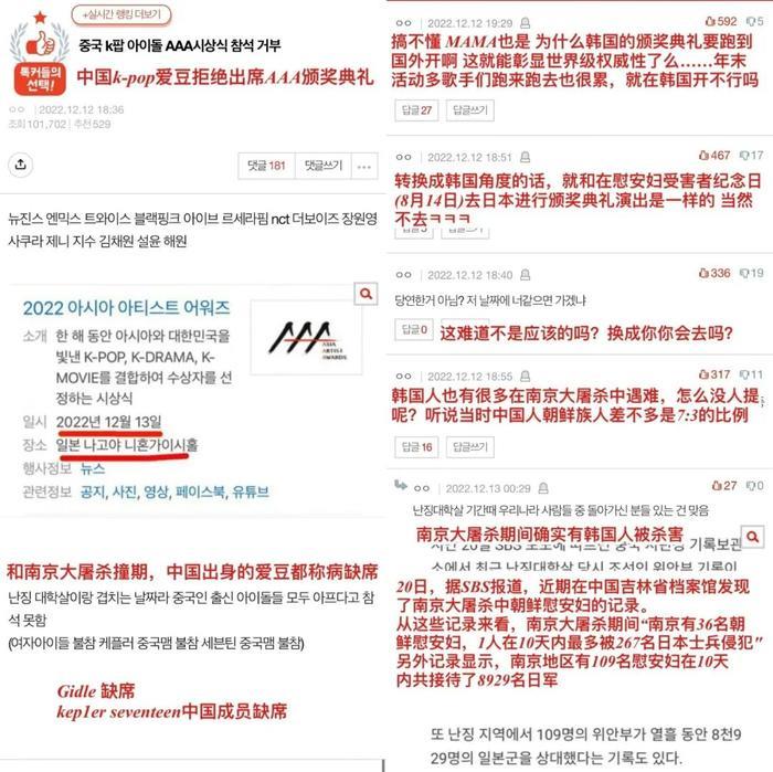 更因与南京大屠杀公祭日撞期,含有中国成员的(G)I—DLE不参加,kep1er成员沈小婷、SEVENTEEN成员文俊辉、徐明浩等多位韩团中国爱豆“因身体不适”拒绝出席此次的颁奖典礼。艺人与公司自觉管理不止中粉们,连韩粉都掌声一片。