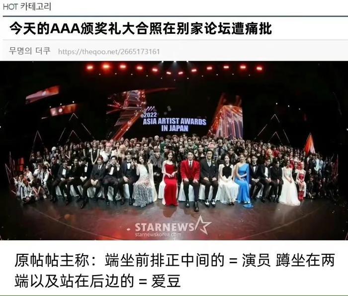 随之而来的AAA颁奖典礼大合照更是让争议声再现新高度。小天使定睛一看,张元英与演员们坐在椅子上,剩下的爱豆和歌手除了站着蹲着,还有的竟然席地而坐!这是什么区别对待!