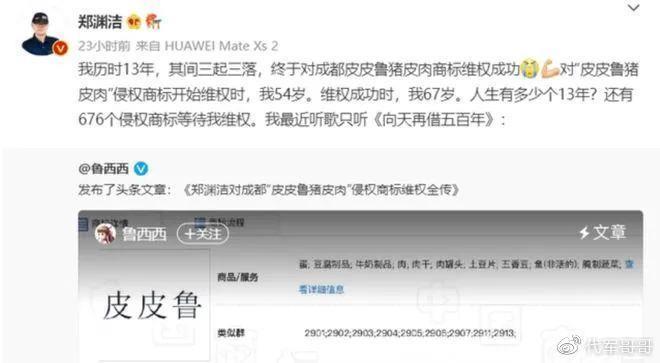 此前,郑渊洁也曾取得过维权的成效。2022年6月,国家知识产权局曾裁定成都“皮皮鲁”牌猪皮肉商标侵权、商标无效。但相形之下,还有更多或直接侵权或打擦边球、“碰瓷”的商标在恣意横行。