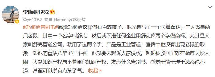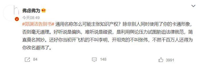 有人表示:“在滥用自己的影响力”,还有人表示:“通用名称怎么可能主张知识产权?除非别人同时使用了你的卡通形象,否则毫无道理。好听说是偏执,难听说是碰瓷,是利用舆论压力试图胁迫法律就范,简直莫名其妙。”对这样的说辞,不知郑渊洁有何感想?