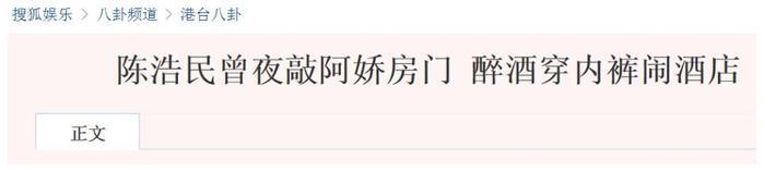 陈浩民经常喝得烂醉如泥在女星面前胡言乱语,甚至还会动手动脚!这样的行为让阿娇非常不满,更过分的是陈浩民喝醉后在阿娇的酒店骚扰过她。那时陈浩民穿着内裤站在阿娇酒店房门口大喊阿娇名字,要求阿娇开门,阿娇不愿意便拒绝了他。他又转头去另一个女演员房间也遭到拒绝,最后助理来将他带回才结束了这场闹剧。