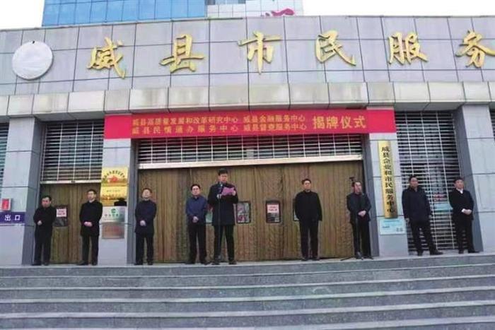 2月22日上午,威县举行高质量发展和改革研究中心、金融服务中心、民情通办服务中心和督查服务中心“四中心”揭牌仪式。(威县县委改革办提供)