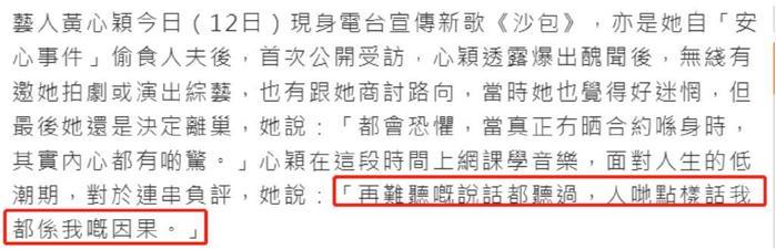 当天她正为自己的新歌《沙包》做宣传,这是多年之后首度接受采访,黄心颖表示自己被骂是自己的因果。