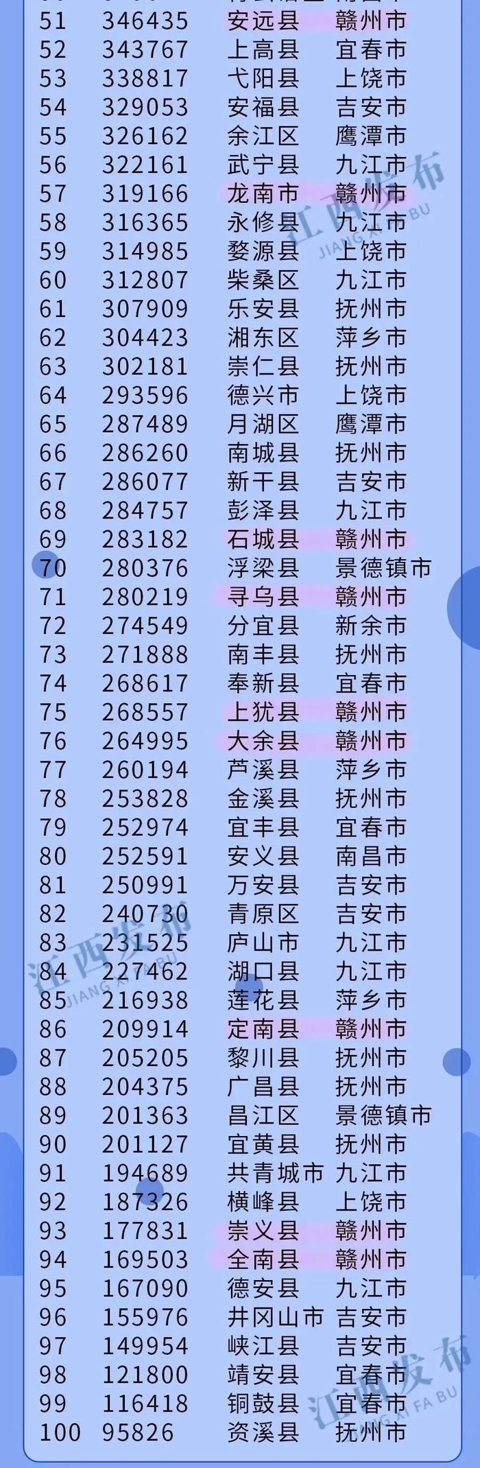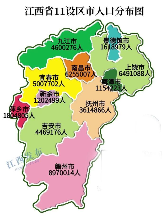 换个角度来看:江西省人口最多的县(南昌县1452502人)是我省人口最少的县(资溪县95826人)人口总数的15倍:
