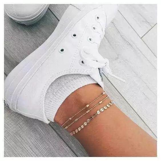 所以,松垮、纤细的脚链是首选。铂金和白银的颜色,比较百搭,能和大多数鞋子搭配。