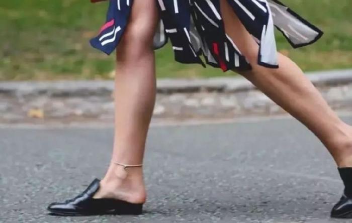 平底的穆勒鞋和脚链是好搭档。穆勒鞋的用色和材质相对简单、朴实,色彩丰富的多层脚链,能弥补穆勒鞋的单调。