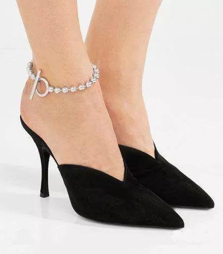 浅口高跟鞋通常出现在日常工作、聚会的场合,会露出大面积的脚背,纤细的脚链更能凸显高跟鞋的摇曳生姿。
