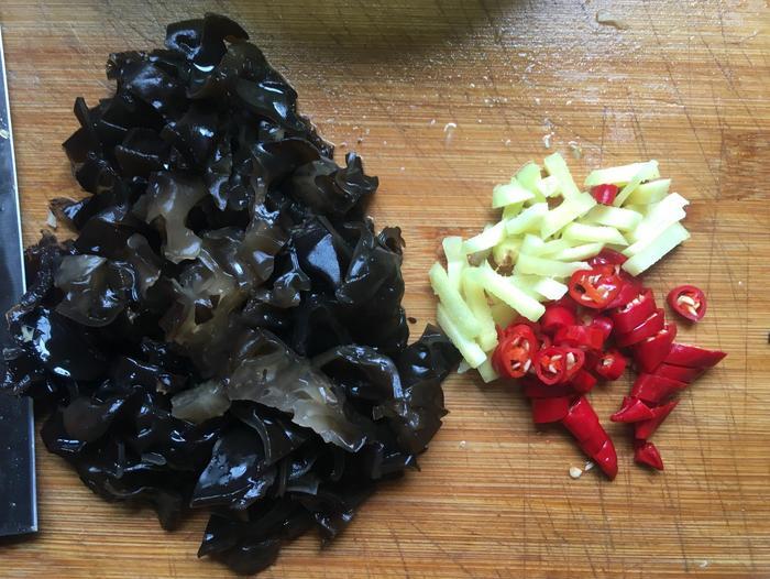 将木耳,香葱以及辣椒都清洗干净,再用刀把它们都切碎,然后生姜去皮切碎,放在案板上备用即可。