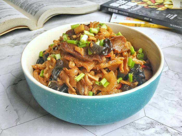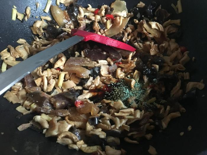 等翻炒萝卜丁大约两分钟左右以后,将切碎的黑木耳也倒进锅里面,继续翻炒即可。