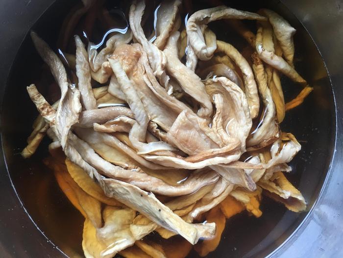 将家里的萝卜干放在盆里面,然后接上适量的清水,把它提前泡发。