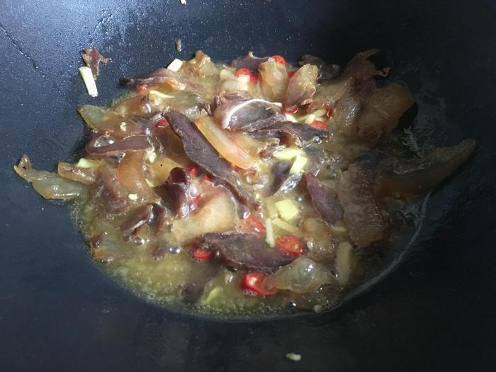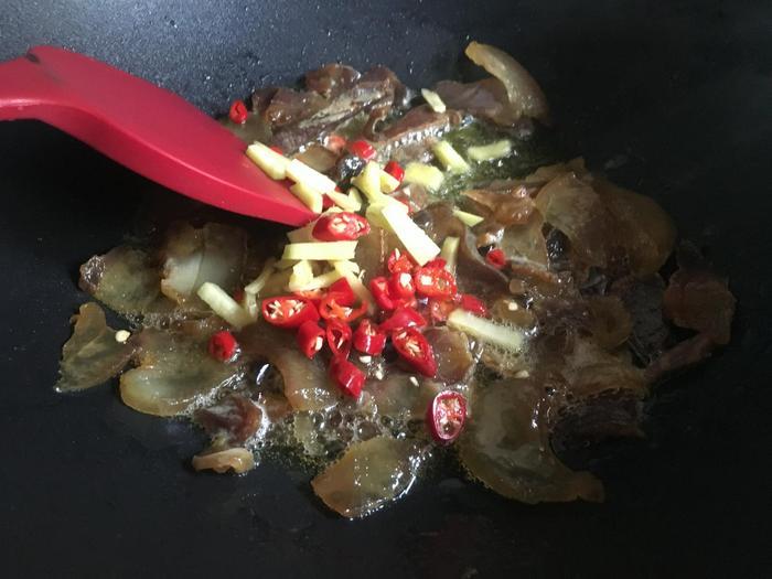 等到腊肉里面的肥肉部分,已经被炸的变成透明的以后,向锅里面加入切好的姜末和辣椒,进行翻炒。