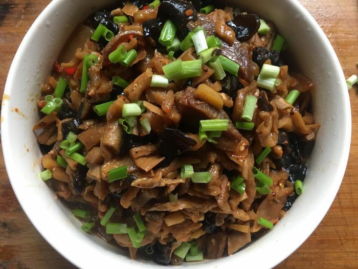 腊肉200克,萝卜干1小把,湿的黑木耳100克,生姜10克,小红椒5个,香葱2根,料酒适量,食盐适量,