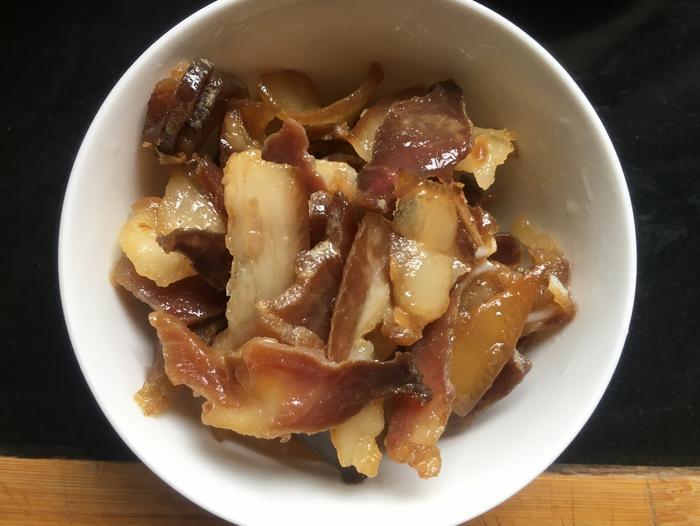 将妈妈已经切碎放在油坛子里面的腊肉片,按出来放在碗里面备用,如果家里的腊肉是放在冰箱里面储存的腊肉块,那大家就要进行一遍焯水,然后再切片备用。