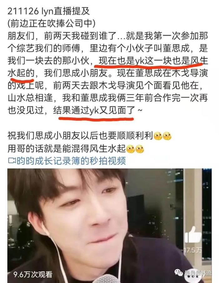 还有中国艺人刘宇宁在自己的直播中提到自家公司悦凯时,确认董思成已经和悦凯签了约一事。
