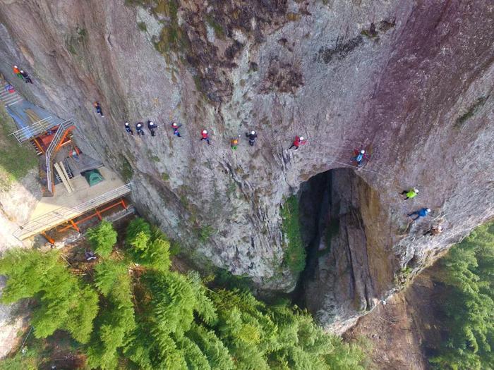 若从空中俯瞰,沓屏峰整座山峰呈现数字“8”的形状,右边为飞拉达A线,长度400米,高约80米,攀爬时间约2小时;