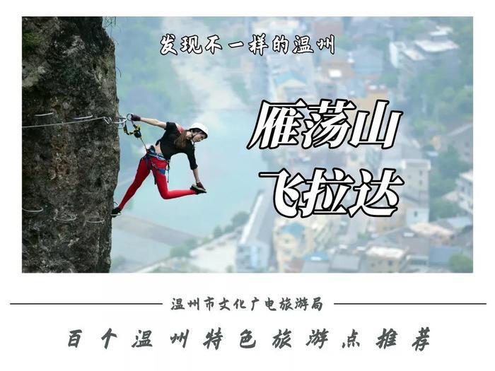 雁荡山飞拉达,修建于温州市乐清市龙西乡仙人坦村高度300米的山峰-沓屏峰上,形状似天门。飞拉达,意大利语“ViaFerrata”音译,意为铁道式攀登,利用铁索、脚蹬的辅助,进行峭壁攀爬的登山方式。让不会攀岩的人也能体会天然峭壁上的惊险刺激。