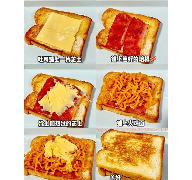 制作方法如下:在烘好的吐司上铺上一块早餐芝士,再依次铺上烟肉、芝士、火鸡面,芝士(热量不容小觑)。简美味由此诞生,完成!