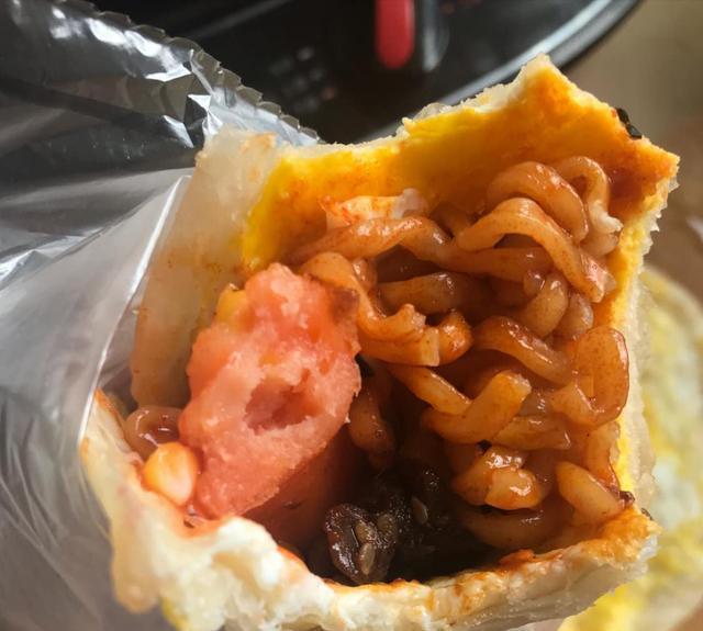 1、火鸡面卷饼小汐试过用辣条卷饼吃,却从没想过把魔爪伸向火鸡面。看到网友分享的这一种吃法小汐觉得很可,值得一试。多了一层卷饼的中和,辣味应该有所降低了趴!