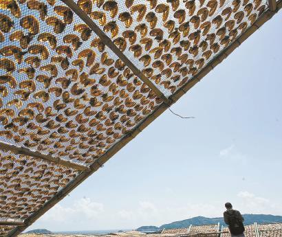嵊泗县嵊山镇上的养殖户在晾晒贻贝干。 资料照片