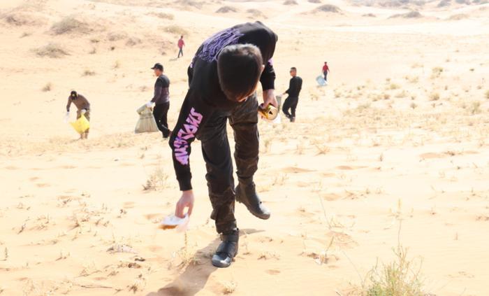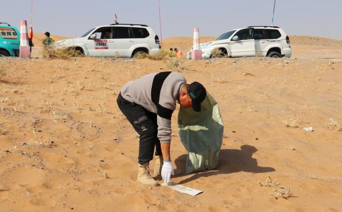 参与活动人员以车队为单位,对腾格里沙漠的大V沟、小V沟等热门冲沙打卡地以及穿沙公路沿路、阿拉善梦想沙漠汽车航空文化主题乐园周边地区进行了垃圾清捡,沙漠中的矿泉水瓶、易拉罐、废弃汽车部件等被一一捡起装入垃圾袋中随车带走。