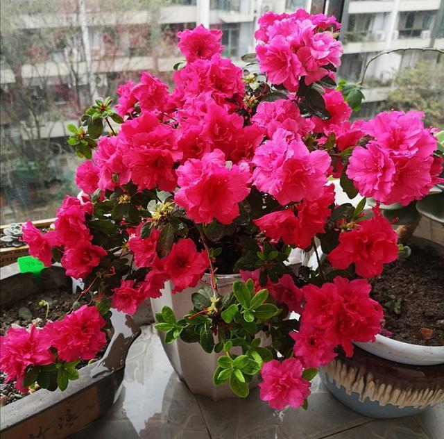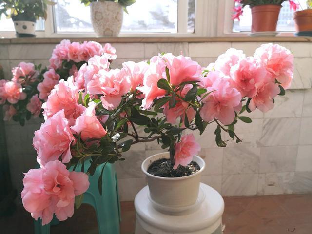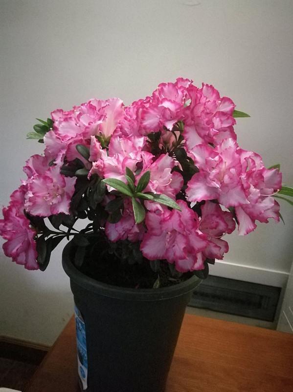 西洋杜鹃花,为阳台盆栽而生,植株低矮,叶绿花美,花期几乎全年