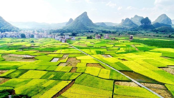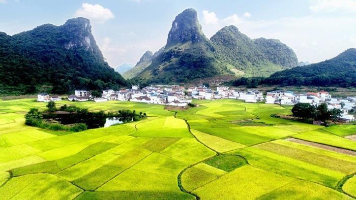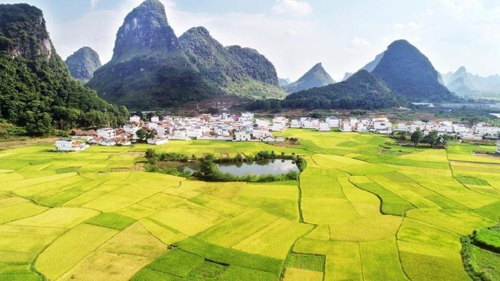 立秋节气临近,广西河池市罗城仫佬族自治县12.06万亩早稻全面进入成熟收割期,农村各地金黄色的稻田与座落有致的村庄、漂亮的民房、远处的青山等相互映衬,构成一幅幅美丽的丰收田园画卷。