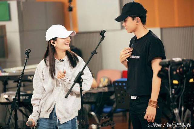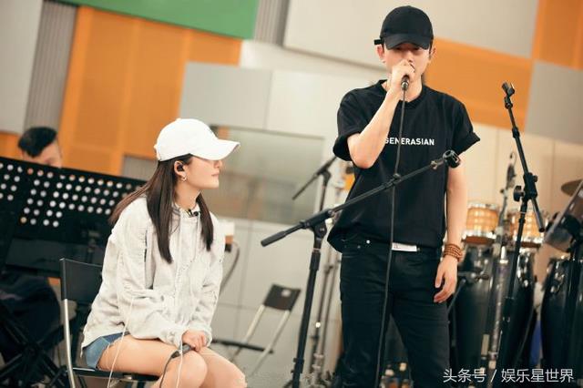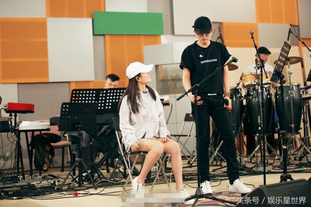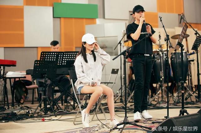 夫妻俩穿着休闲,娜姐身着灰色卫衣搭配牛仔短裤,戴了顶白色的帽子,坐在椅子上听着杰哥的演唱。张杰一身黑帅气十足,手拿话筒全身心地投入到排练中。