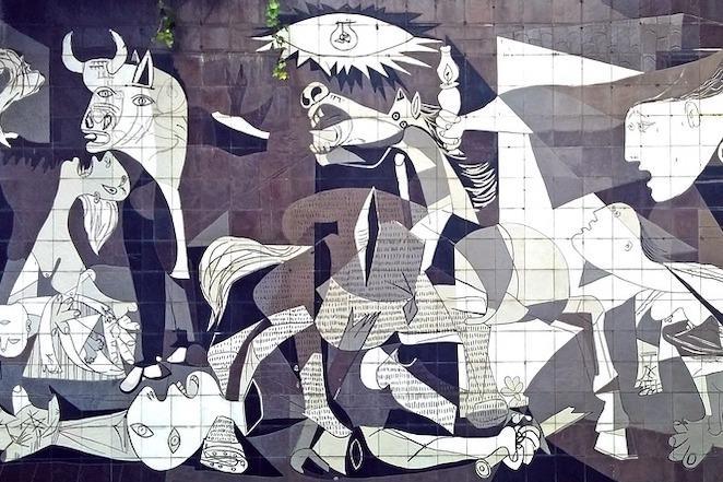 当人们凝视毕加索的Guernica绘画时,可以看到人们敬畏地站立。马德里的雷纳·索非亚博物馆(Museo Reina Sofia)的画布由蓝色,黑色和白色构成,几乎覆盖了整面墙。