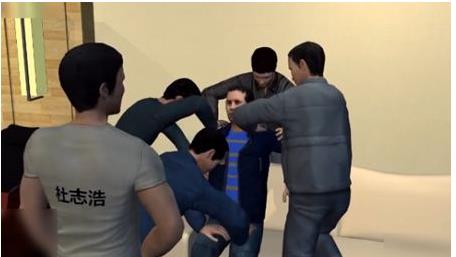 他拉着母亲想跟警察一起走,可是却被讨债人员死死拉着,他们拿起凳子朝于欢杵着,于欢一步步后退被逼到办公桌角。