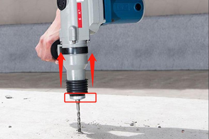 这类电钻采用的是“卡扣式”的钻头,更换的方法也没有想象中那么复杂,在断电的情况下,直接握住冲击钻的前端,然后向握臂的方向推,钻头就可以卸下来了,安装的时候也是这种方法,推到底之后,把钻头放进去,松开之后“卡扣会回弹”卡住钻头,如上图一所示的方向。