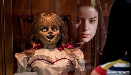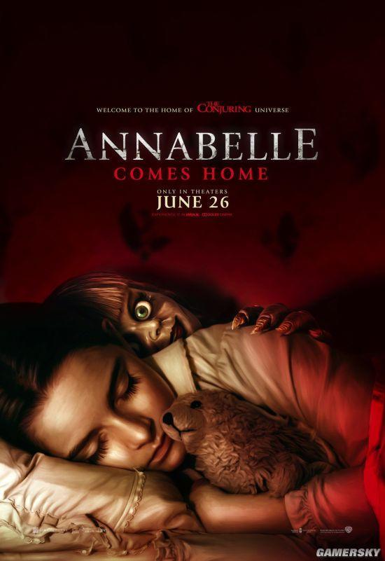 恐怖片《安娜贝尔3:回家》吓人海报 鬼娃娃睡在萝莉身后