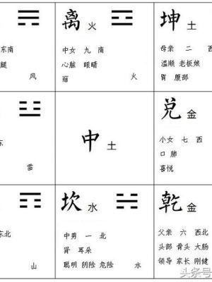 希望通过以上的比喻,对照第二张图片术语,把八卦和九宫一条对号入座,还有一些八卦的万物类象也对号入座,相应的了解一下,你也许很快就能记牢而且很难忘记了。