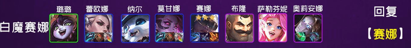 这版本和之前的版本环境大不相同,超高爆发阵容不算太多,这就让这套搭配4白魔羁绊的白魔赛娜得以强势崛起。这套阵容强的不是在4白魔给全员增加的高魔抗,而是4白魔+萨勒芬妮让阵容的恢复能力逆天 ,阵容续航能力堪称版本最强 。只要前排棋子莫甘娜、蕾欧娜与布隆能抗住第一波伤害,阵容就能快速回血,大多数对局下甚至出现结束后只损失1-2枚棋子的情况。