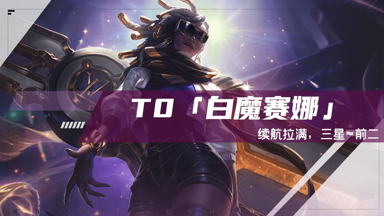 8人口后 :4-5或5-1升8人口,添加萨勒芬妮开出3名流羁绊,之后开始追3星赛娜,顺带追莫甘娜的3星,如果是开3约+2黑魔的情况下也可追璐璐3星。如果在8人口如果赛娜不胡,也可考虑5费卡来C金克丝、泽丽或卡莎谁来的多都能替换赛娜,转型白魔九五。