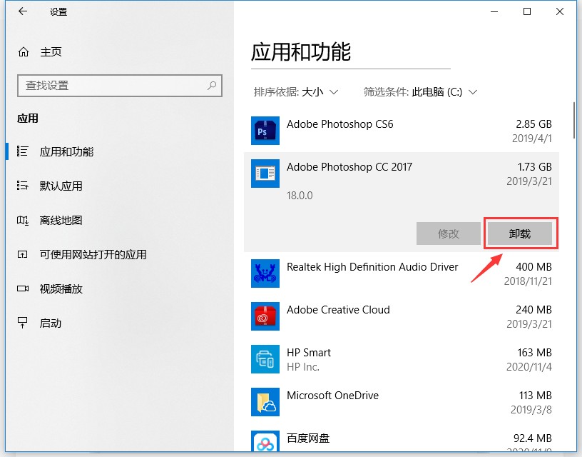 打开Windows设置页面,选择「应用和功能」,然后将筛选排序方式更改为「大小」,筛选条件为「C盘」,就能查看到排名靠前的大容量软件,选择一些不用的软件卸载即可。